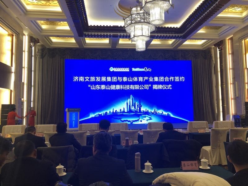 2019年1月1日,新年的第一天,濟(jì)南文旅集團(tuán)與泰山體育集團(tuán)戰(zhàn)略合作簽約暨“山東泰山健康科技有限公司”揭牌活動(dòng)在舜耕山莊隆重舉行。省委常委、濟(jì)南市委書記王忠林,省體育局局長李政,市委常委、秘書長蔣曉光,副市長王桂英,副市長孫斌參加活動(dòng)。