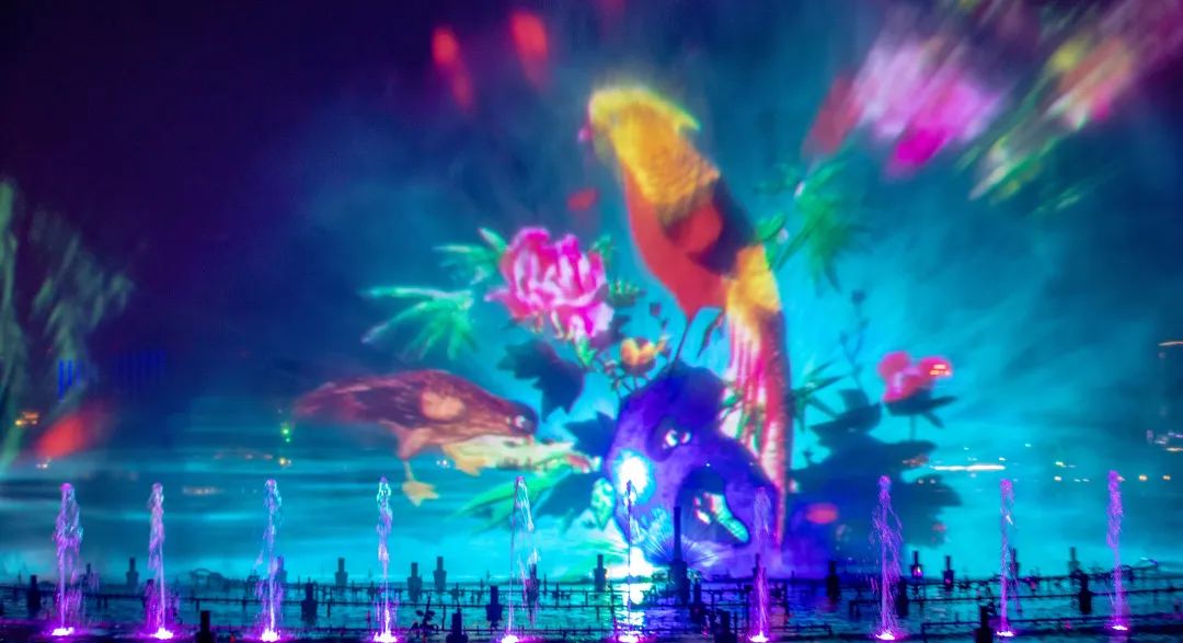 噴泉、月屏、浮臺在夜色中交相輝映