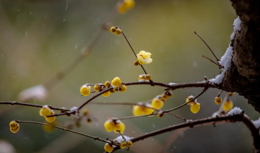 飄揚的雪花裝飾著景區(qū)的紅燈籠